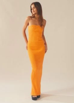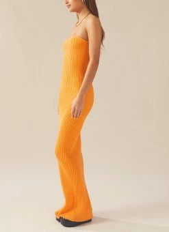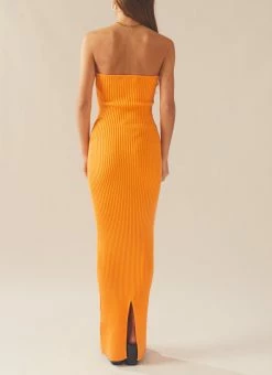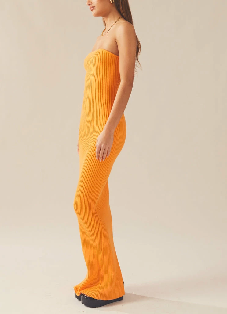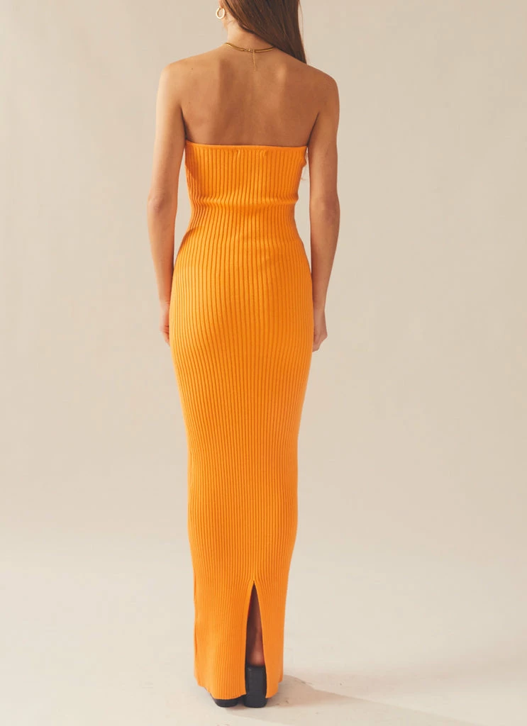 Flirty and fun! The Amber Knit Dress is a strapless maxi dress crafted in our eye catching orange hue ribbed knit. An elegant figure hugging style with a sublet split at the back of the dress. We love this look styled back with chunky gold jewellery and your favourite mules.