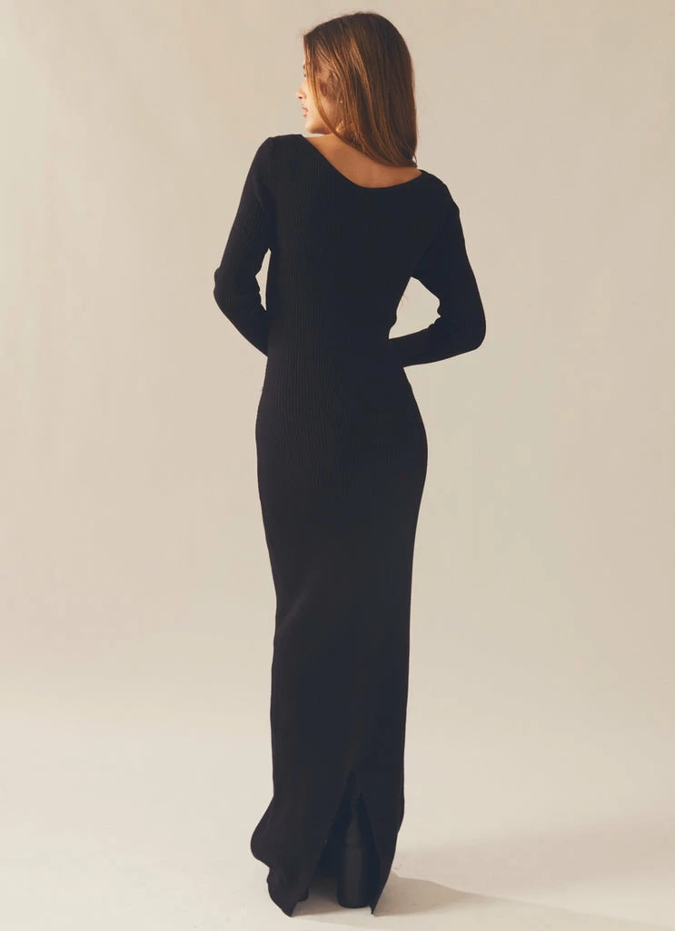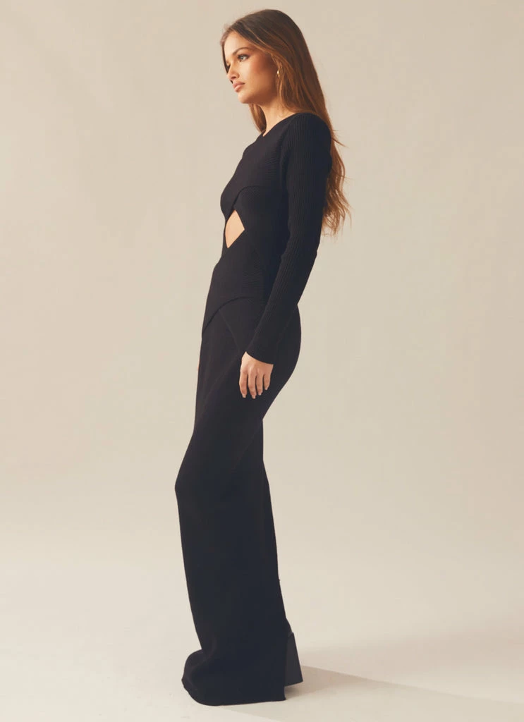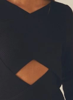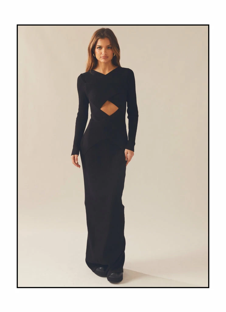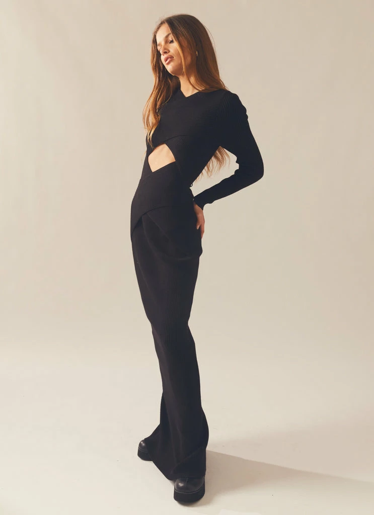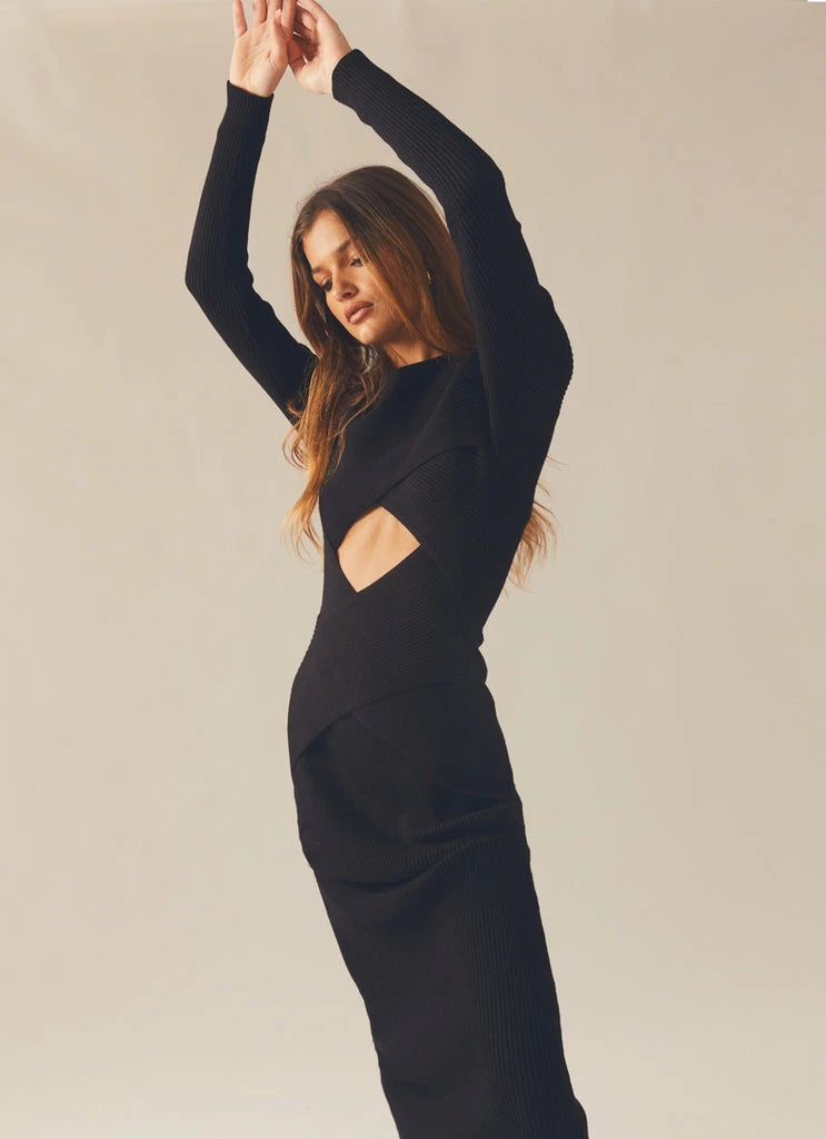 Weβre keeping you hot this winter with the Carmen Knit Midi Dress. A figure hugging dress crafted in thick ribbed knit fabric with cross over detailing through the body that creates a cut out shape under the bust. An elegant cut with long sleeves and small split at the bottom of the left leg, easily dressed up with gold earrings and mules.