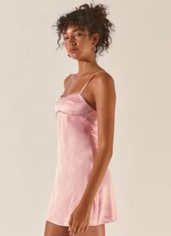 Paris Hilton called, she said THAT’S HOT! The Divine Destiny Diamante Mini Dress is a silky little number crafted in a soft pastel pink and features contrasting diamante detailing around the bustline.
