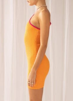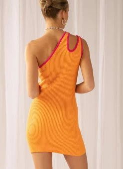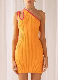 Give him the cold shoulder babes! The Easy O the Eyes Mini Dress is exactly that, crafted in ribbed knit fabric with a bodycon fit and feminine one shoulder detailing. Made in our eye-catching tangerine hue with contrasting pink ribbed binding at the armhole and neckline.