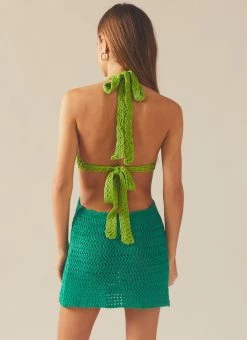 Handpicked for your summer vacay! The Heaven Crochet Dress is a halterneck mini dress with cut out and o-ring detailing at the bust. Poolside chic with a simple earring and flatform mules or ready for your next beach party layered over swimwear with sandals.