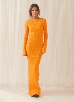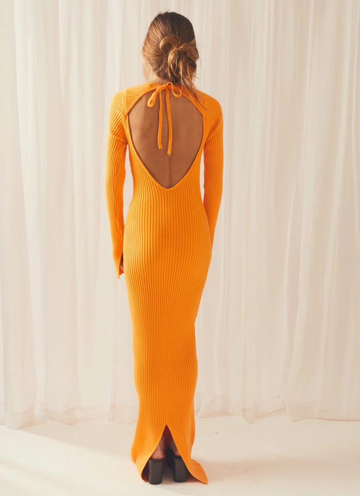 Sexy and sophisticated int he Helena Knit Tie Midi Dress. A slinky thick ribbed knit with a low back that ties across the shoulder blades. Crafted in our eye catching orange hue, the midi dress is the versatility your wardrobe needs! Perfect with sneakers for an everyday look or styles with heels for cocktail hour.