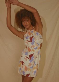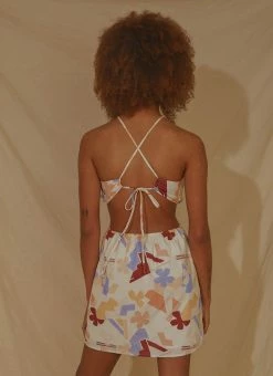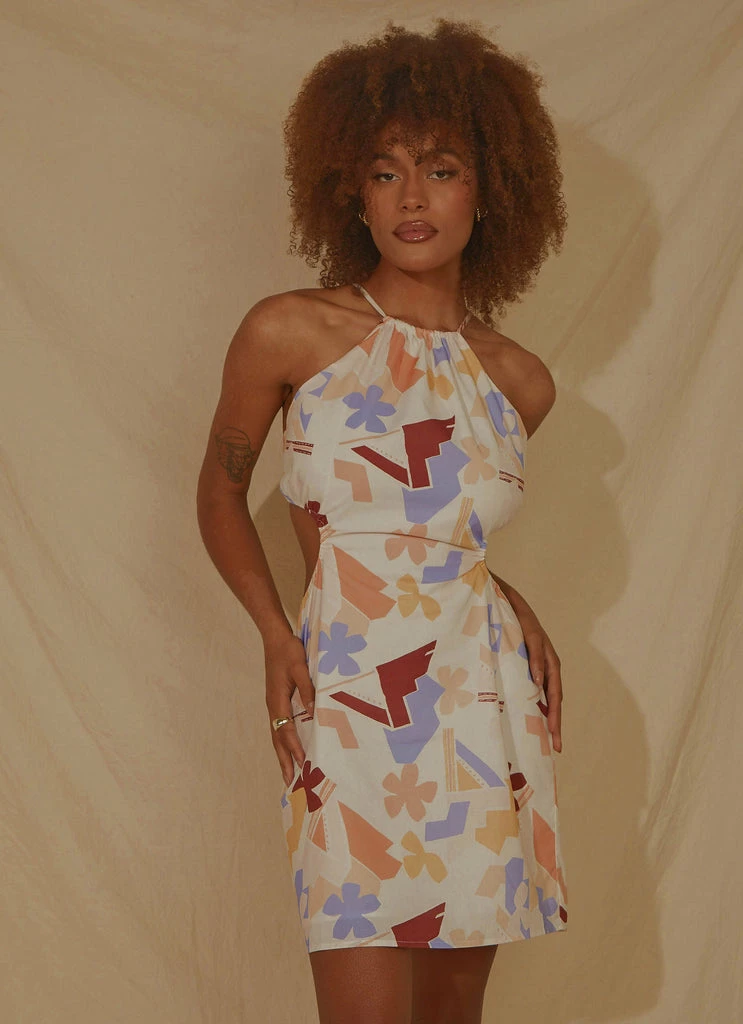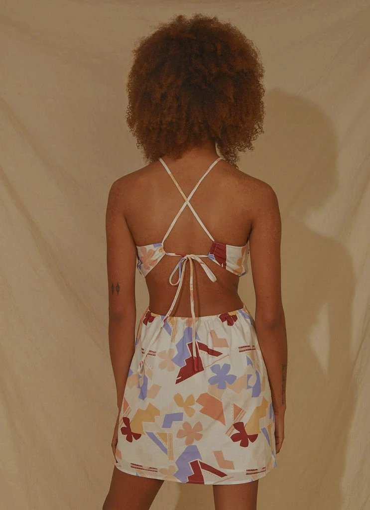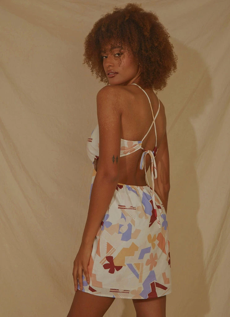 We’re having a major moment! The LouLou Mini Dress has a soft abstract print and features a high neckline with a slinky open back and adjustable tie straps. Picture this on your next vacay with a strappy sandal and simple earrings.