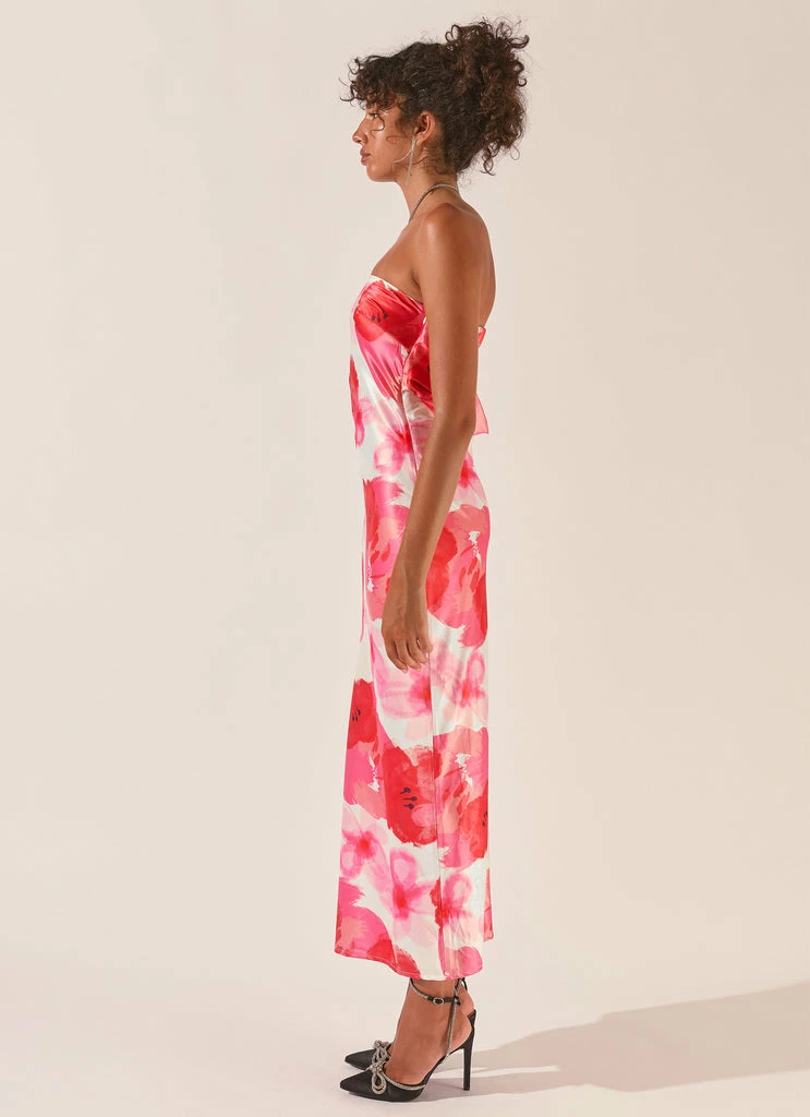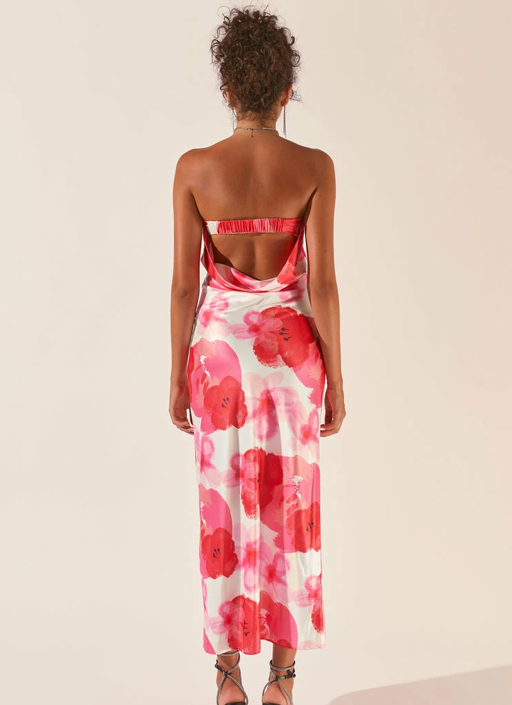 Fun and flirty, you’ll have heads turning in the Love Me MoreΒ Maxi Dress. A straplessΒ maxi dress crafted in a silky satin fabrication with our exclusive eye-catching floral print featuring a strap detail between the shoulder blades and elegant cowl back.