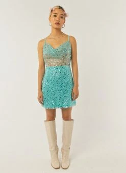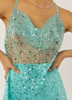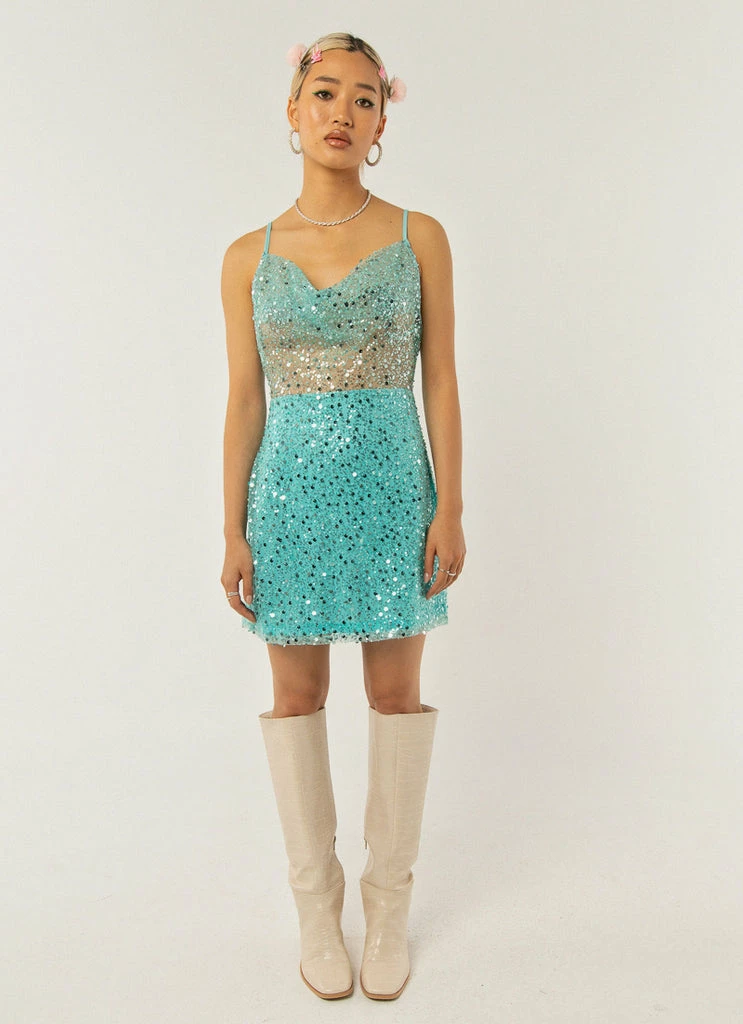 The perfect festival fit doesnβt exi….Say hello to our Night To Remember Dress! A slinky little mini dress crafted from sheer mesh with sequin detailing throughout and featured a flattering cowl neck and spaghetti straps that cross over between the shoulder blades. Made for groovin’ with the gals.