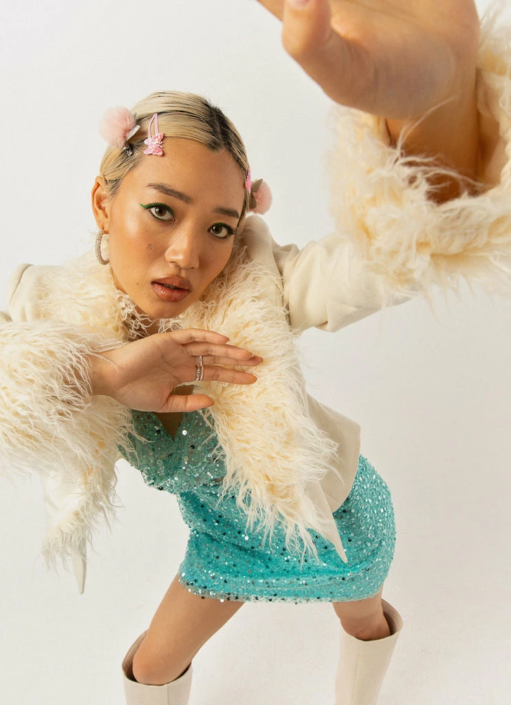 Selina is 170cm and wears size US 4 (Small or AU 8 equivalent)