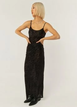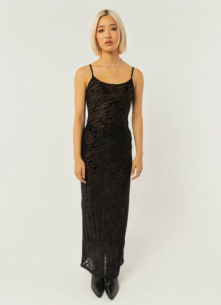 Made for the party girl! The Quinn Burnout Midi Dress is crafted in sheer black mesh with velvet zebra print. Show them your wild side and style it over swimwear with sneakers or boots and layered jewellery.