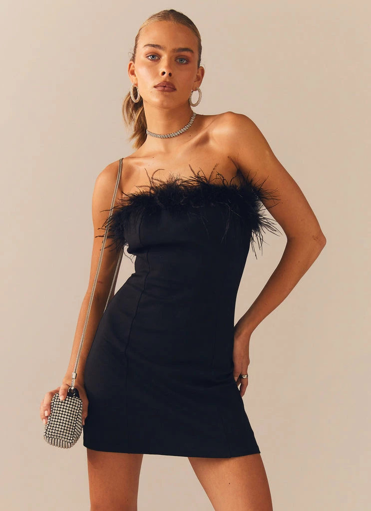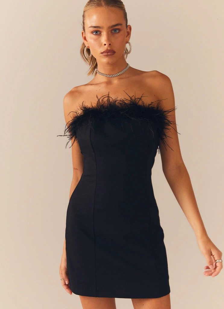 The chicest little mini! Our Starlight Dancer Dress is the perfect combination of sexy and cute featuring feathered detailing at the bust-line and structured mini dress design.