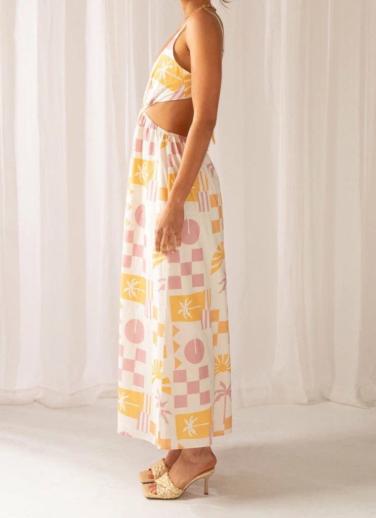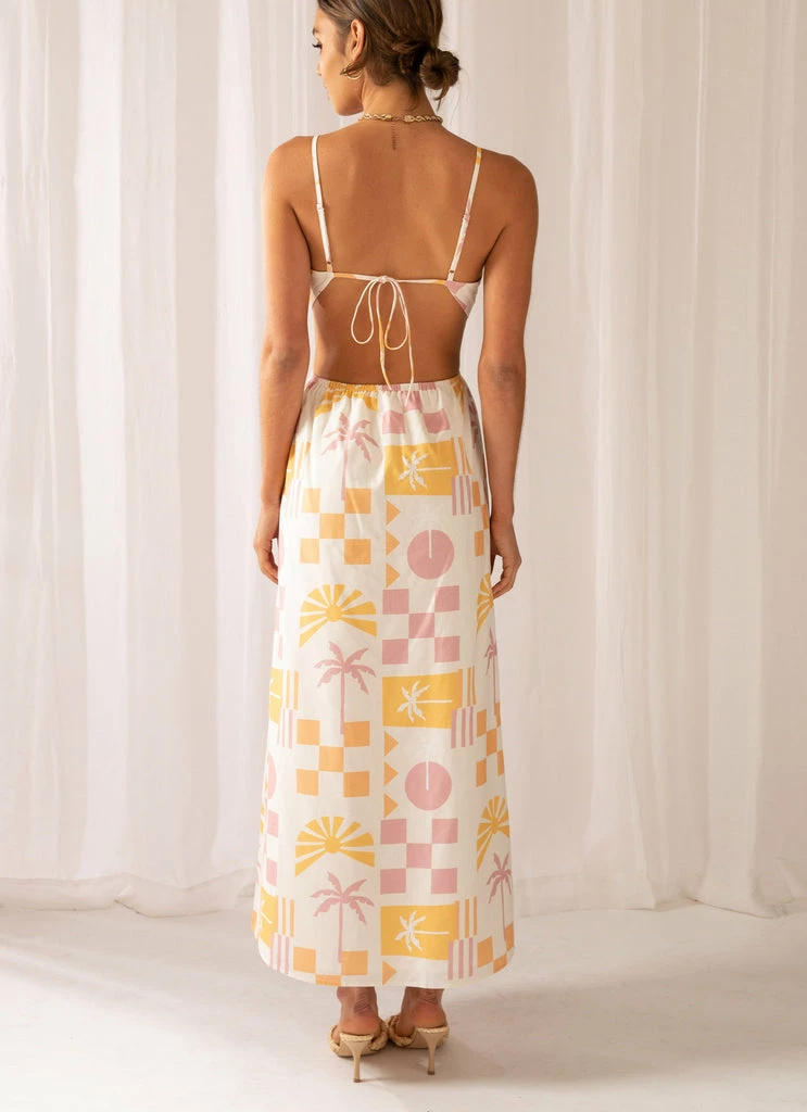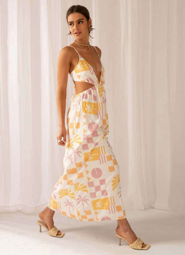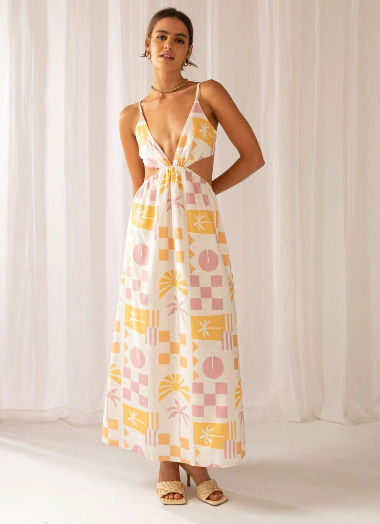 Sunset drinks just got cuter! Crafted from a light linen blend, the Sunstruck Midi Dress has an elastic waist with a plunging v-neck and cut-out detailing under the bust. Keep it simple with gold jewellery and your favourite pair of mules.