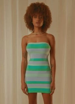 Timeless stripes are always a good idea! This cute lil mini is perfect for date night featuring stripes in blue and green hues and sleek strapless style. We love it with a simple earring and your fave heels!