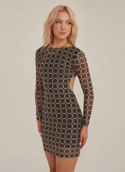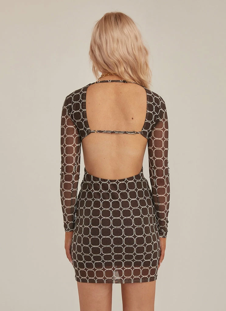 What retro dreams are made of! A fitted mini dress with sheer mesh arms featuring a geometric print and open back with an elegant strap across the shoulder blades.