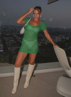 They’ll be dying to get a glimpse of you in this! A sleeved crochet mini dress in our eye catching green hue featuring a simple scoop neck. The perfect festival fit with boots, layered over swimwear.