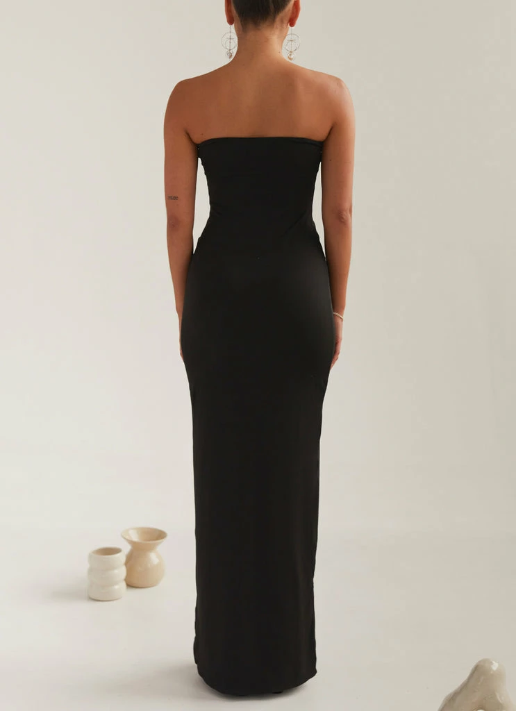 Create the sexiest silhouette wearing our Sculptural Pieces Maxi Dress. This figure-hugging maxi dress is a strapless style featuring 3 keyhole cut outs down the front of the bodice.